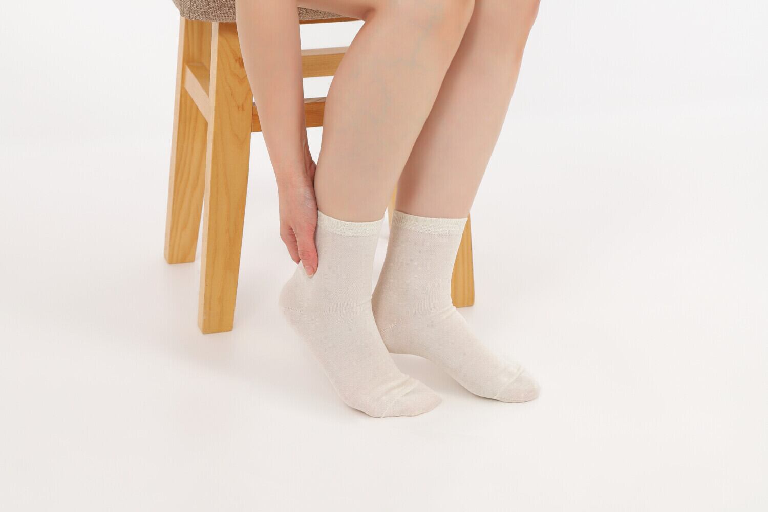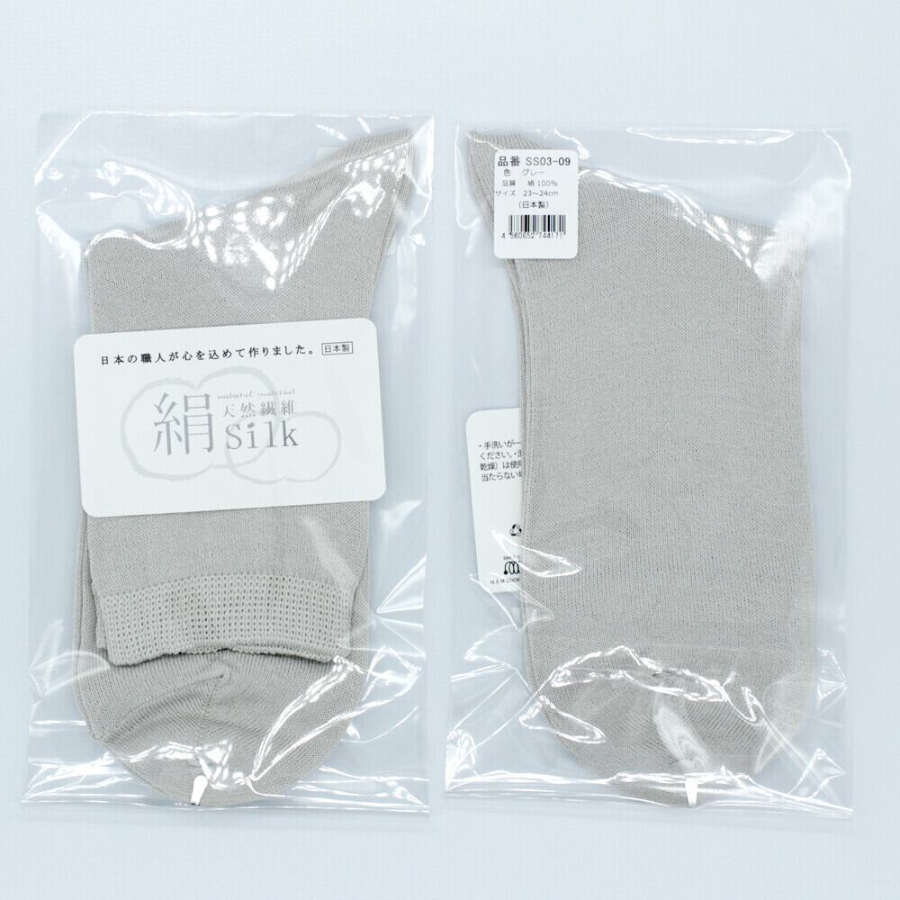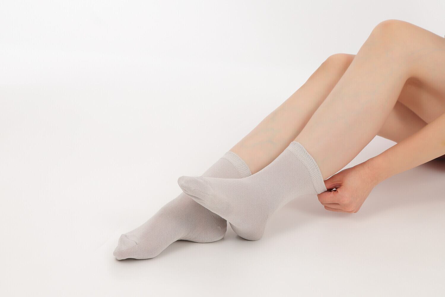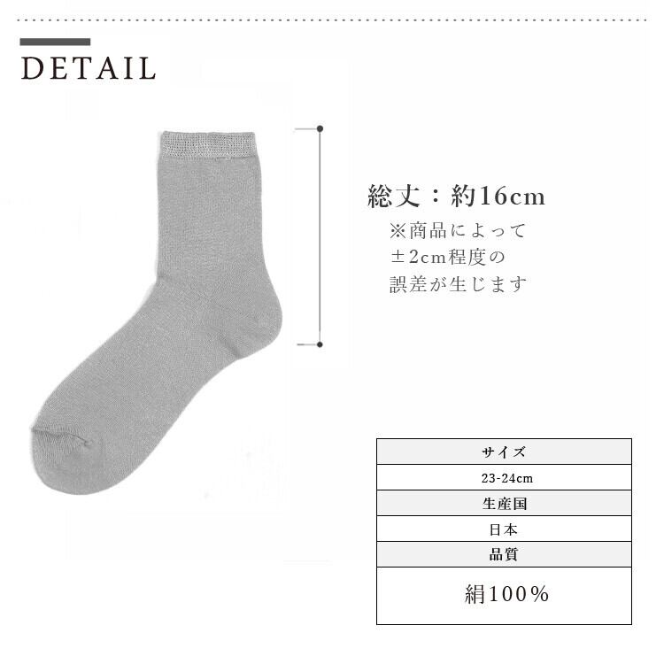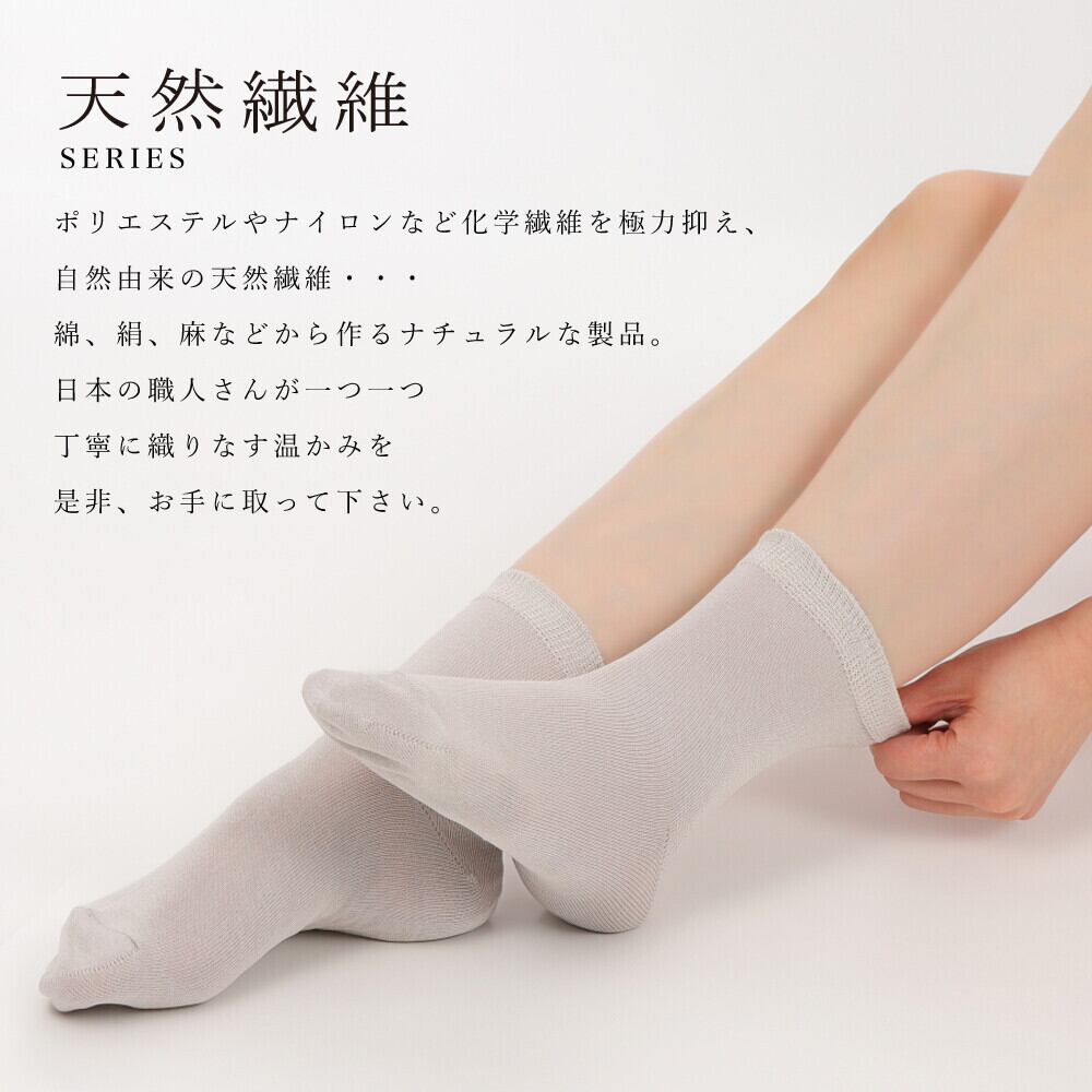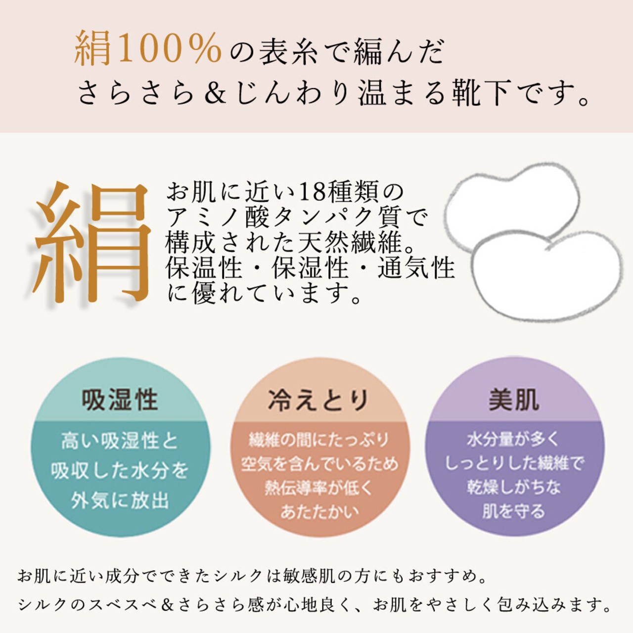 天然繊維の「シルク」は人の肌に近いタンパク質で組成され吸湿性、放湿性に優れているので、蒸れにくく肌に優しい靴下です。
