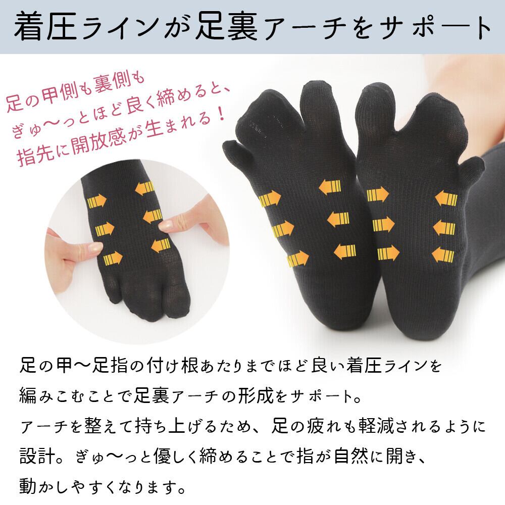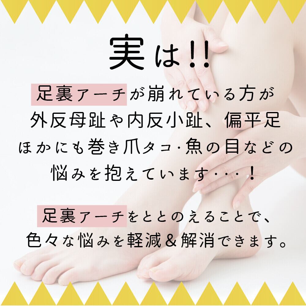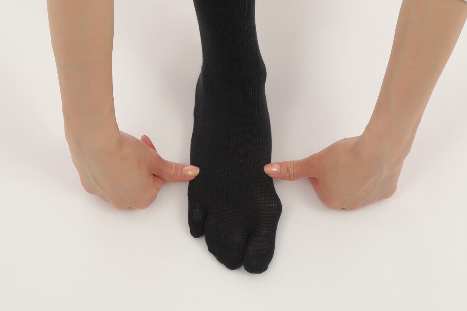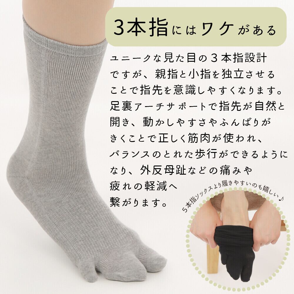 3本指靴下は足裏アーチの崩れから引き起こされる外反母趾や内反小趾、偏平足など様々な悩みを軽減&解消するための設計です。