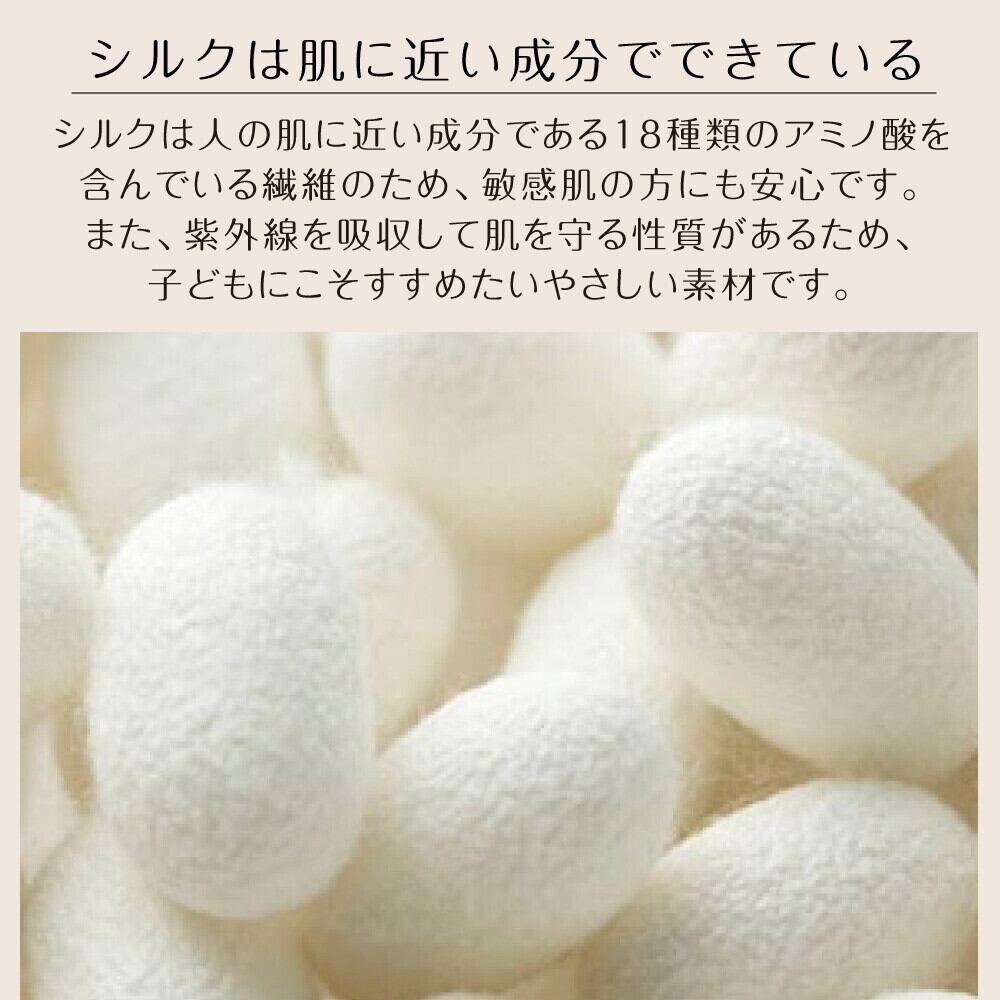 シルクは人の肌に近い成分でできているため、お肌にやさしく、保温性や吸水性が高く汗を吸ってさらっと快適に。