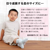 良く伸びる編み方で作っているため、9〜15cmとベビー(生後6か月〜)からキッズ(4〜5歳頃)まで長く履いて頂けます。